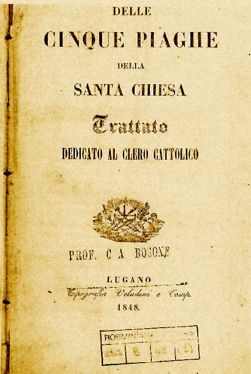 Ritornato al Calvario di Domodossola, concluse nel 1832 Delle Cinque Piaghe della Santa Chiesa, l’opera più famosa, che sarà pubblicata a Lugano solo nel 1848, senza il nome dell’autore, dopo l’elezione di Pio IX al soglio pontificio: una disamina dei mali che affliggevano la Chiesa cattolica già nella prima metà di quel secolo: “La divisione del popolo dal clero nel pubblico culto”; “La insufficiente educazione e formazione del clero”; “La divisione dei vescovi”; “La nomina dei vescovi abbandonata al potere temporale”; “I beni temporali che rendono schiavi gli ecclesiastici”.